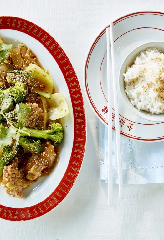At the end of the cooking time, serve with steamed rice and garnish with toasted sesame seeds and coriander